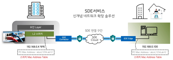 SDE서비스는 SASE솔루션의 하나로 재택이나 지사 등의 원격지에서도 본사의 네트워크 스위치에 케이블을 연결하는 것과 같이 네트워크를 확장하는 서비스입니다.