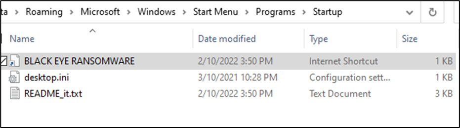 또한, 사용자가 재부팅 시에도 실행되도록, 시스템 재부팅 시 실행되는 “BLACK EYE RANSOMWARE”실행파일이 %Startup% 디렉터리에 추가 됩니다.
