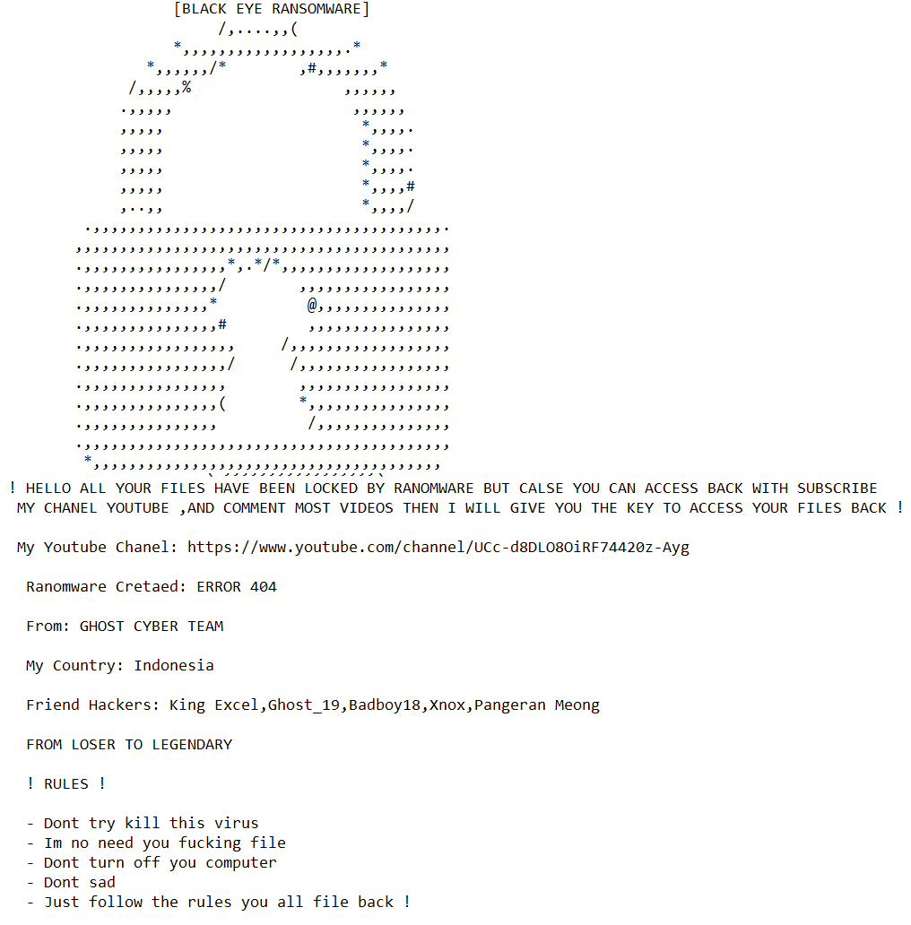랜섬웨어 공격자는 대체로 피해자에게 돈을 요구하지만, 최근 발견된 BLACK EYE RANSOMWARE는 피해자에게 돈을 요구하는 대신 YouTube 채널의 구독과 댓글을 요청하는 것으로 확인되었습니다.