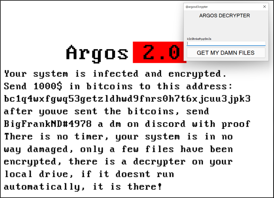 최근 Argos 2.0 랜섬웨어에 대한 이슈가 확인되었습니다. 대부분의 랜섬웨어는 멀웨어 형태로 피해자 PC에 침투하여 파일을 암호화하며, 파일 복구를 위해 비트코인으로 금전적 대가를 요구합니다. 하지만 Argos 2.0 랜섬웨어는 리버스 엔지니어링을 통해 쉽게 암호 해독 키를 얻을 수도 있고, 공격자에게 금전적 대가를 지불하지 않고 해독 키를 받을 수 있습니다.