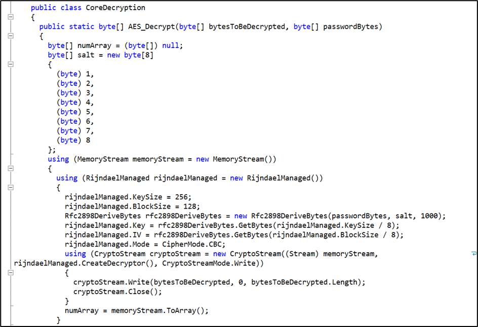 하드 코딩된 암호 해독 키는 대상 디렉터리와 함께 디컴파일된 코드에서 쉽게 볼 수 있습니다.