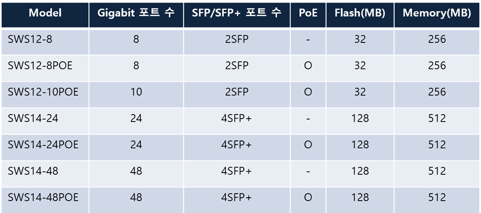 포트 수 및 PoE지원 여부 별로 사내에 적정한 모델로 선택하여 사용하시면 되실 것 같습니다.