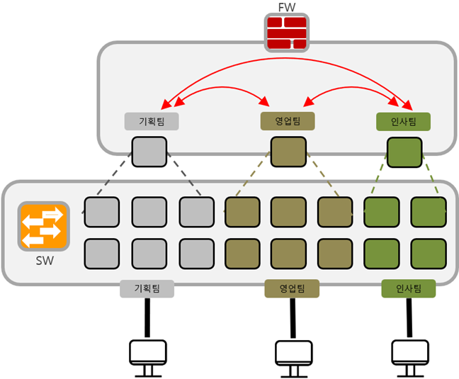 이러한 장점을 통한 활용 방안으로 스위치 포트를 구분하여 사내 부서별 관리 및 운영이 편리해질 수 있습니다.