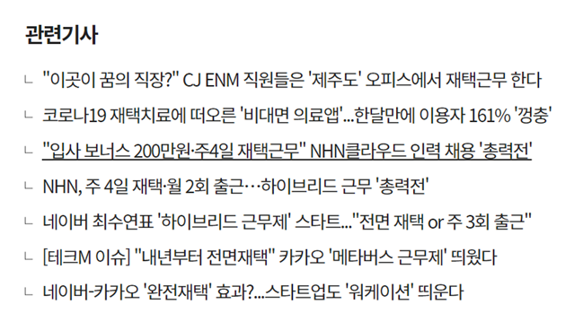 반면, 국내 많은 기업들은 엔데믹으로의 전환 후에도 기존과 같은 근무형태로 돌아가는 것이 아니라 펜데믹 기간 동안 적용하였던 재택근무와 같은 비대면 근무 환경을 유지하거나 회사 마다 여러가지 방법으로 근무환경을 변화시키고 있는 것 같습니다.