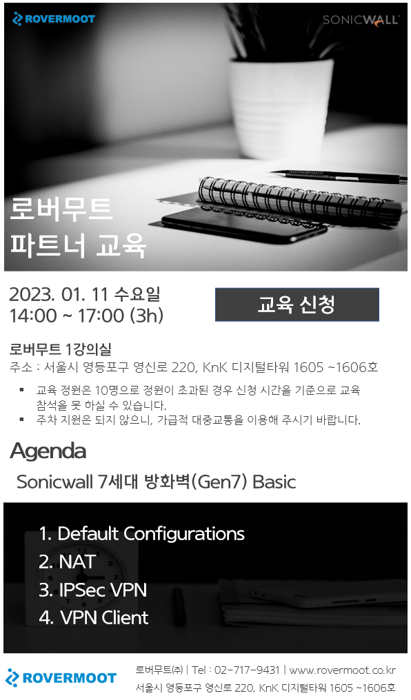 로버무트 본사에서 진행하는 Sonicwall 7세대 방화벽(Gen7) Basic 교육이 아래와 같이 예정되어 있습니다.