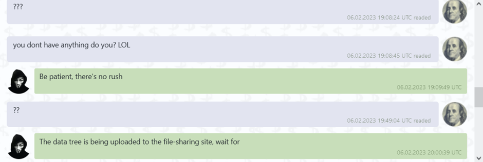 피해자 페이지에는 "지원" 채팅 상자가 표시되며, 이를 통해 공격자와 직접 통신할 수 있습니다. 랜섬웨어 운영자는 일반적으로 피해자와 협상하고 추가 압력을 가하기 위해 이것을 사용합니다.
