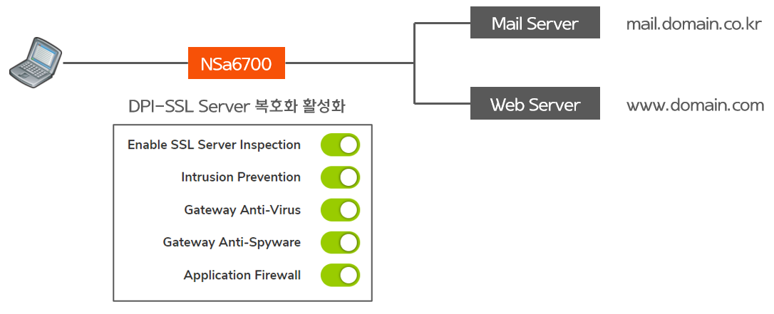 예를 들자면, 아래와 같은 환경에서 Client가 Mail Server에 웹접속을 하여 멀웨어 파일을 첨부한다면, 암호화된 HTTPS 트랙픽을 복호화 처리한 후에 보안 정책을 적용 받아 첨부 시도가 차단됩니다.