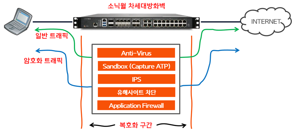 이러한 복호화 환경은 복호화 전용 장비를 통해서 구현이 가능하지만, 소닉월의 차세대방화벽의 복호화 기능을 통해서도 구현이 가능합니다.