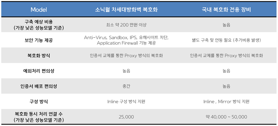 아래는 소닉월 차세대방화벽 복호화와 복호화 전용 장비 간의 비교 테이블 입니다.