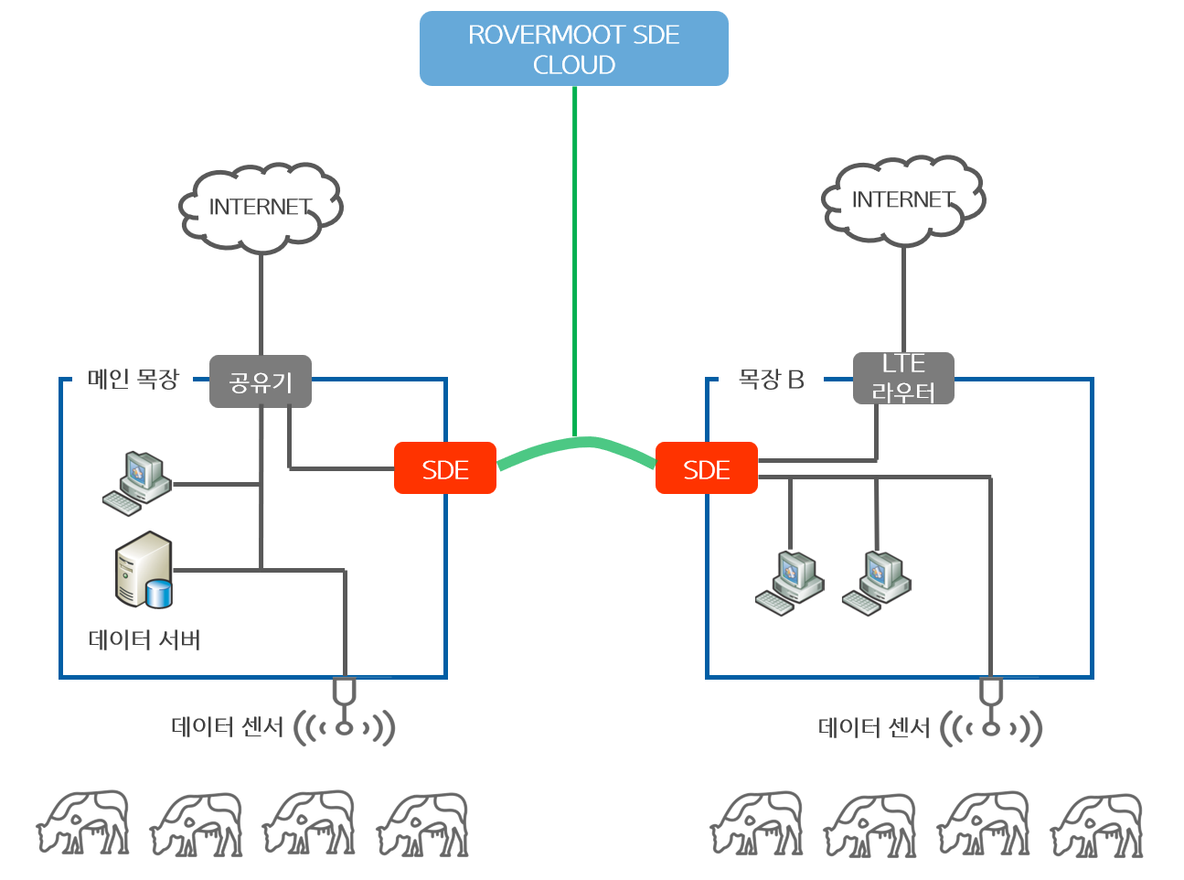 SDE 단말기를 각 목장의 공유기 등의 네트워크 장비에 연결하는 것만으로 목장 간에 네트워크가 확장되어 지점 목장에 위치한 가축들의 생체 데이터들도 메인 목장의 서버에 모두 수집됩니다.