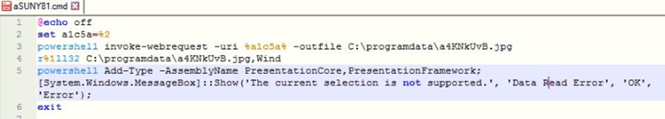 배치 명령 파일은 다른 배치 파일을 C:\Users\Public\aSUNY81.cmd 에 드롭 및 실행하고 두 개의 인수를 전달하는 PowerShell cmdlet을 실행합니다.