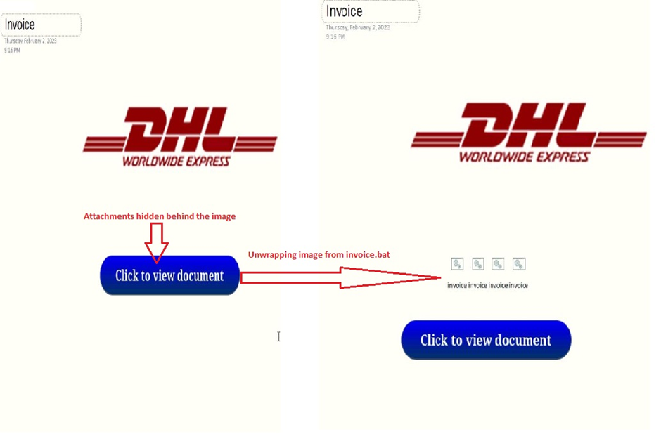 공격자는 OneNote 페이지에 난독화된 배치 파일을 첨부합니다. 이 배치 첨부 파일은 사용자에게 "문서를 보려면 클릭하세요"라고 묻는 이미지 뒤에 숨겨져 있습니다. 파일에는 배송 문서인 것처럼 가장하기 위해 DHL WORLDWIDE EXPRESS라는 텍스트를 표시하는 배경 이미지가 포함되어 있습니다.