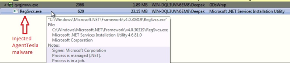 두 번째 PowerShell 인스턴스는 다운로드된 실행 파일의 실행을 백그라운드에서 시작합니다. 이 경우 VBScript 파일이 추가로 실행되어 AgentTesla payload가 RegSvcs.exe에 주입됩니다. RegSvcs.exe는 사용자 데이터를 유출하여 텔레그램이 호스팅 하는 명령 및 제어(C2) 서버인 https://api.telegram.org/bot5729374237:AAEdSD-W5rWlJyyU5nwVKvjLxJBT1jTdKRY/로 전송합니다.