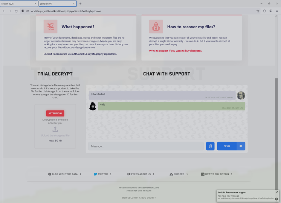 피해자 페이지에는 "지원" 채팅 상자가 표시되며, 이를 통해 공격자와 직접 통신할 수 있습니다. 랜섬웨어 운영자는 일반적으로 피해자와 협상하고 추가 압력을 가하기 위해 이것을 사용합니다.