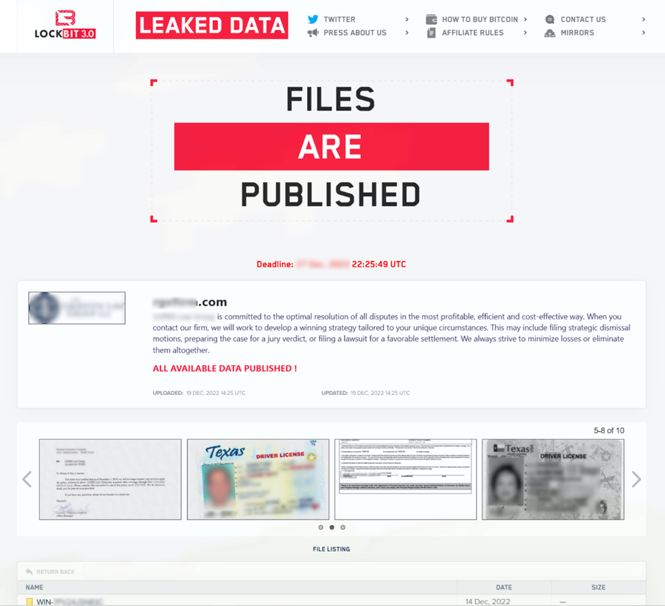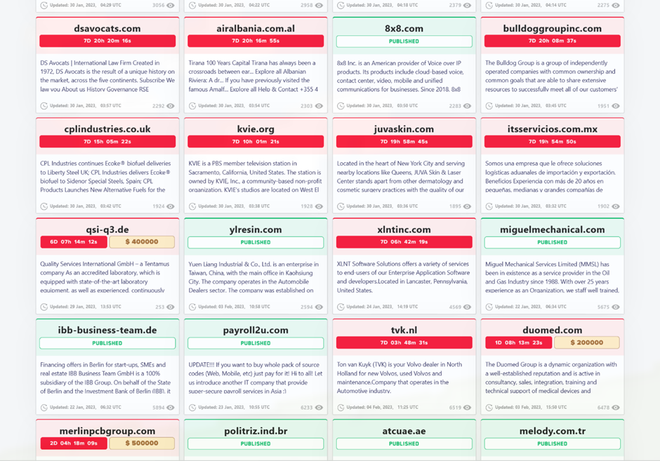 데이터 검색에 대한 지불을 요구하는 것 외에도, 공격자는 몸값을 제때 지불하지 않으면 기밀 데이터를 공개하겠다고 협박하기도 합니다. 이 이중 갈취 방법은 피해자가 몸값을 지불하도록 강요하기 위해 피해자에게 추가적인 압력을 가합니다. 유출된 기밀 데이터는 모든 사람이 볼 수 있도록 사이트에서 공개적으로 사용할 수 있습니다.