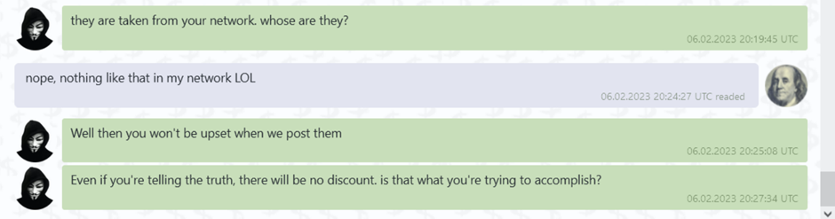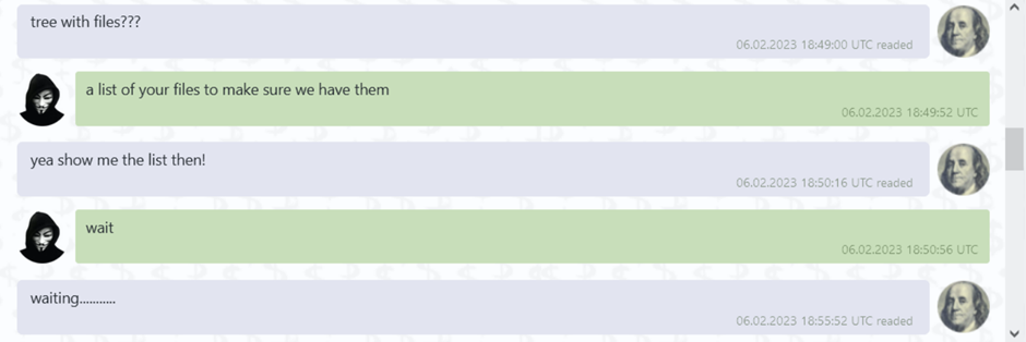 피해자 페이지에는 "지원" 채팅 상자가 표시되며, 이를 통해 공격자와 직접 통신할 수 있습니다. 랜섬웨어 운영자는 일반적으로 피해자와 협상하고 추가 압력을 가하기 위해 이것을 사용합니다.