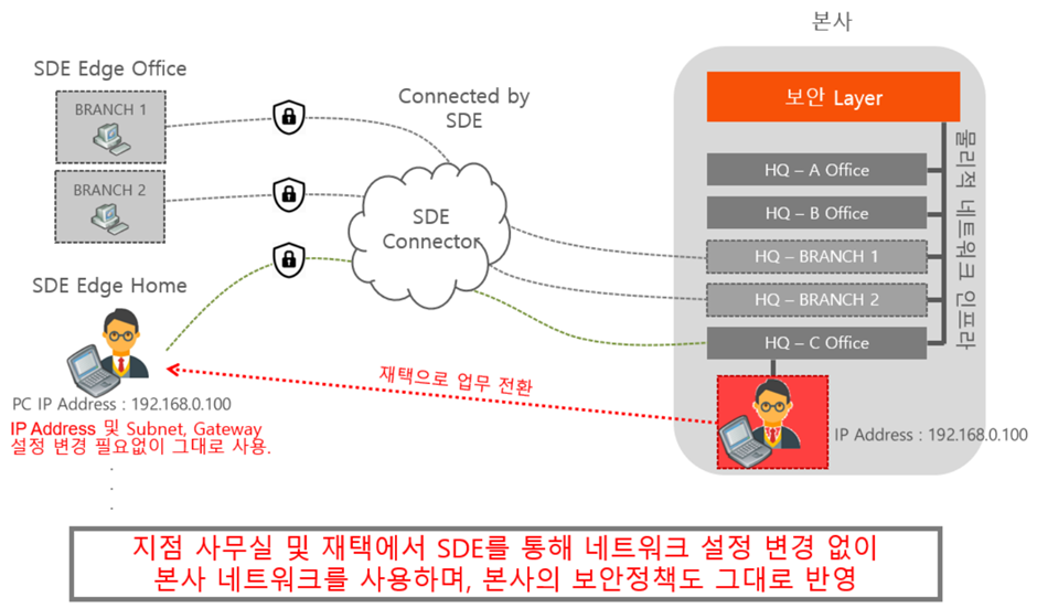 SDE 서비스는 재택을 포함하여, 지점 또는 거점사무실 등의 환경에서 본사와 동일한 보안 정책이나 네트워크를 적용 받을 수 있도록 네트워크 확장 솔루션으로 쉽고 간단하게 재택근무 등의 업무 환경을 조성할 수 있는 서비스 입니다.