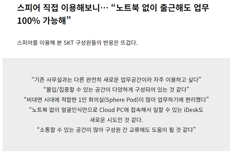 그리고, 단순 재택근무 외에도 재택근무의 단점을 보안하고, 업무능률을 높이는 거점오피스를 도입하고 있으며, SKT의 경우 Sphere 라는 이름으로 거점오피스를 브랜딩 하였습니다.