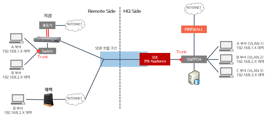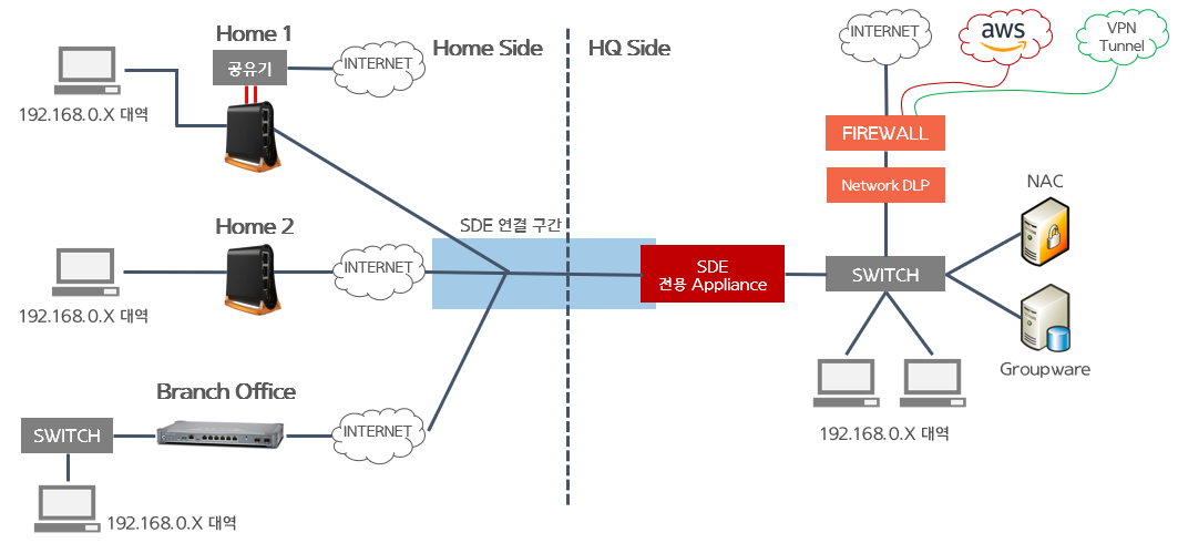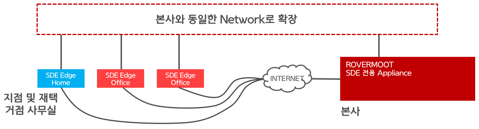 > SDE 전용 Appliance가 위치한 본사로 지점 및 재택이 통합되어 네트워크 연결 확장.