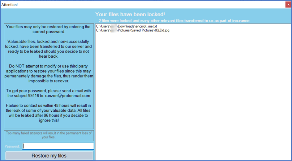 해당 랜섬 노트에는 사용자 파일이 공격자 서버로 전송되었다고 언급되어 있지만, 랜섬웨어에 감염된 기간동안 관찰된 네트워크 트래픽은 확인되지 않았습니다.