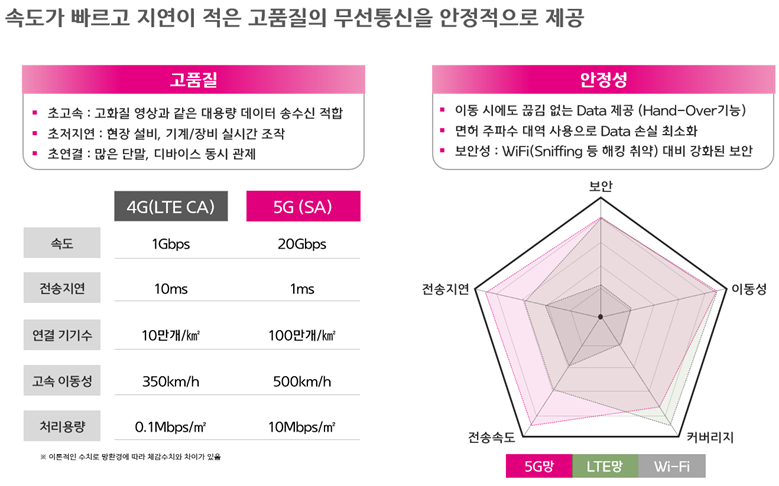 - 핸드폰과 같은 공인된 5G 주파수를 사용하기 때문에 기존의 유선 환경 대비하여 장애 빈도가 적고, 장애 처리가 빠름.
