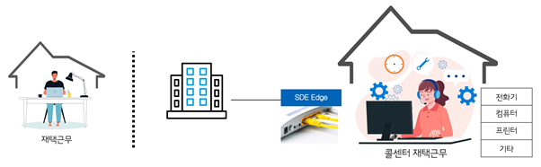 SDE서비스는 SASE솔루션의 하나로 재택이나 지사 등의 원격지에서도 본사의 네트워크 스위치에 케이블을 연결하는 것과 같이 네트워크를 확장하는 서비스입니다.