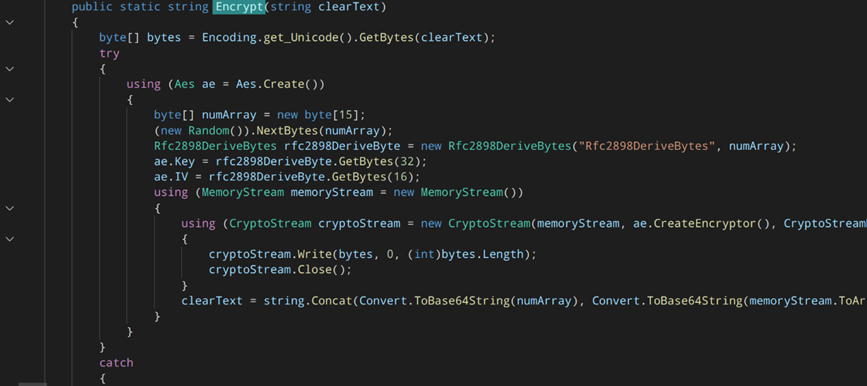 해당 랜섬웨어는 C#으로 작성되어있고, 디컴파일이 간단하며 암호화 및 암호 해독 기능은 아래 코드에서 쉽게 확인할 수 있습니다.