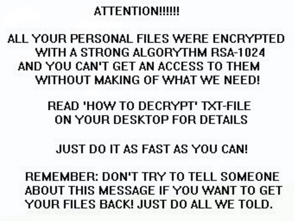 GPcode 랜섬웨어에 감염되면 시스템의 파일이 암호화되며, 각 암호화된 파일에는 " .ENCODED " 파일 확장자가 부여되고, 바탕 화면 배경에 다음 이미지가 표시됩니다.