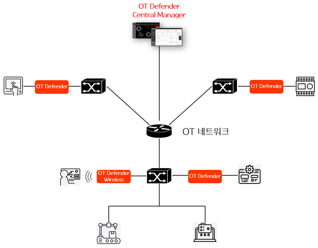 OT Defender는 기존의 네트워크 구성을 변경하지 않고 설비와 네트워크 연결 사이에 위치하며, 일반적인 유선 환경의 OT Defender Wire 솔루션과 무선 환경에서 구성 가능한 OT Defender Wireless 솔루션으로 나눠 제공되고 있습니다.